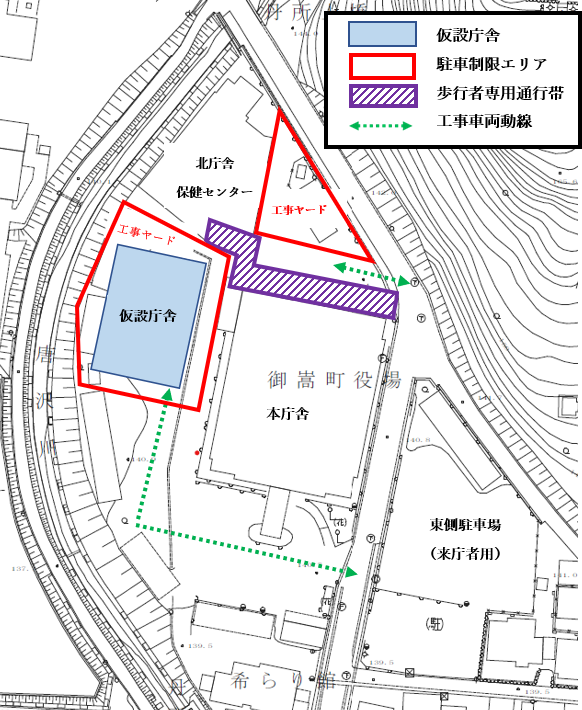 なお、工事期間中、北庁舎、保健センター又は本庁舎裏口(夜間・休日窓口)に御用の方は、歩行者専用通行帯をご利用ください。