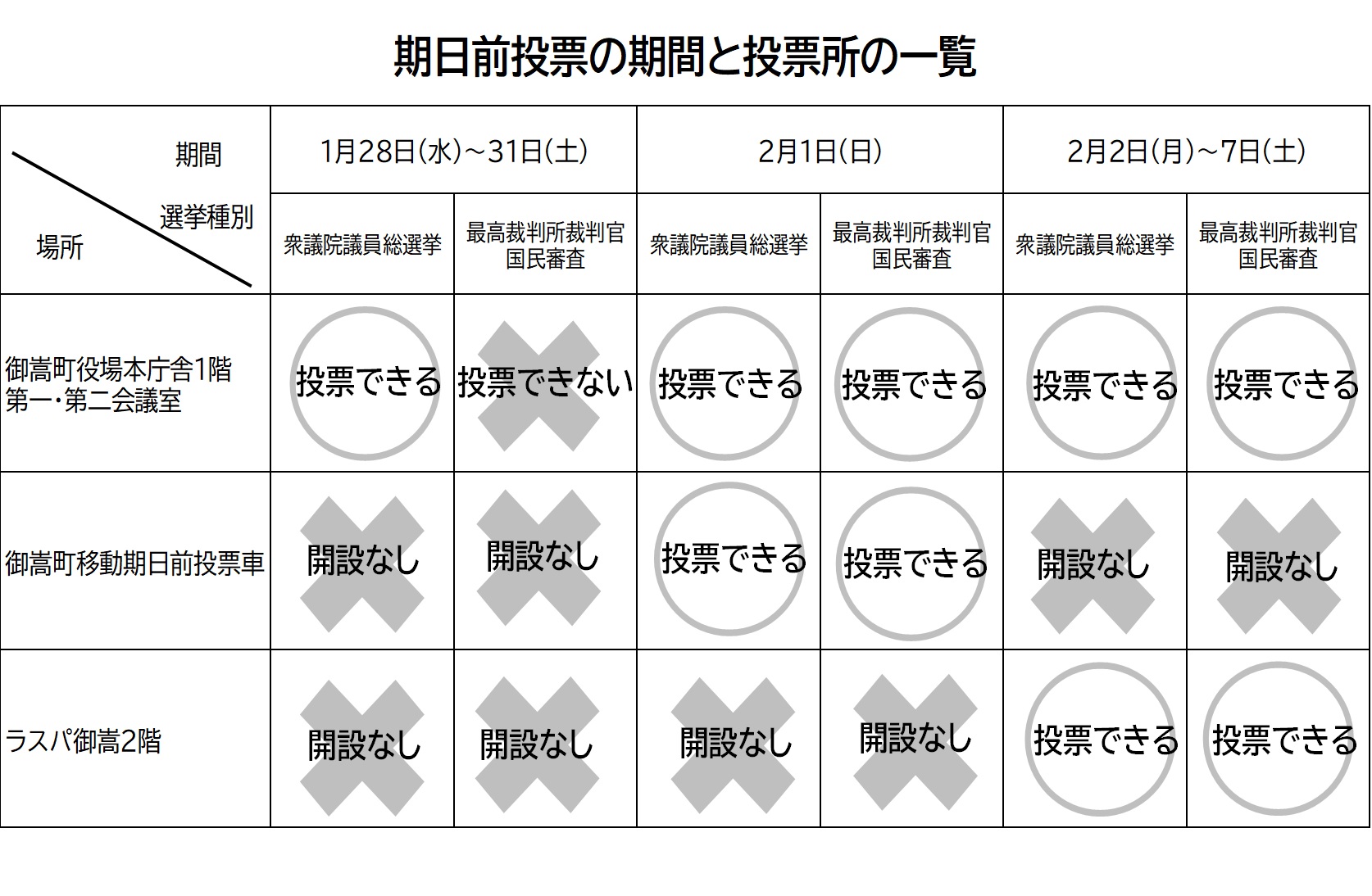 ※なお、通常は指定された投票所でしか投票ができませんが、御嵩町では全投票所を「共通投票所」としますので、御嵩町の選挙人名簿に登録されている方であれば、町内のどの投票所でも投票することができますので、最寄りの投票所にお越しください。