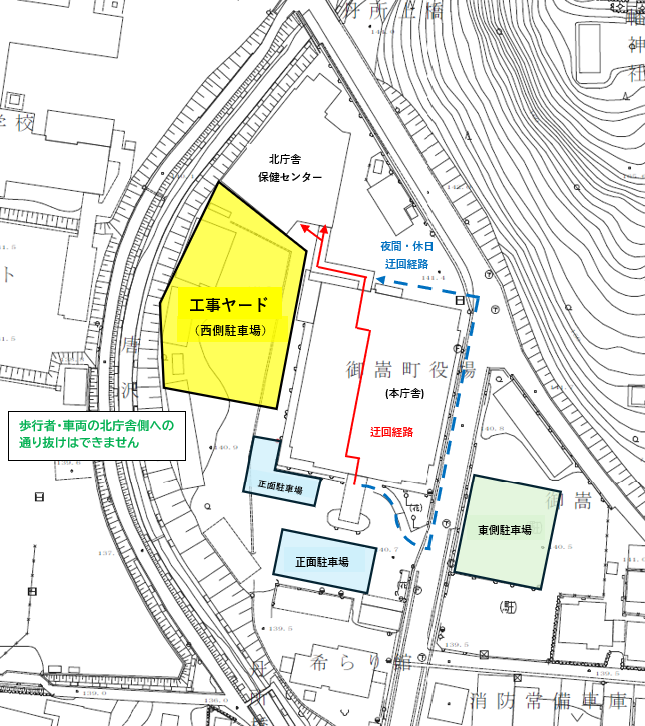 西側駐車場につきましては、工事ヤード設置により歩行者及び車両の北庁舎側への通り抜けができなくなりますので、北庁舎、保健センター又は夜間・休日窓口に御用の方は、下記の図のとおり迂回をお願いいたします。